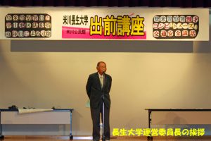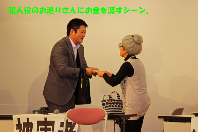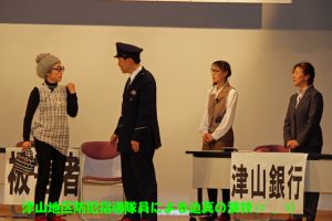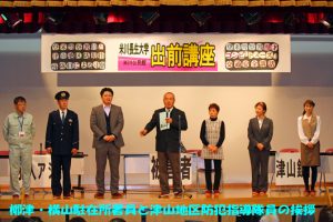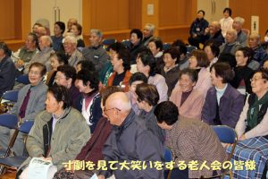 平成28年12月8日(木)米川公民館に於いて、『米川長生大学第3回学習会』が開催され、85名の長生大学の皆さんが参加しました。第一部では、柳津・横山両駐在所のお巡りさんと津山地区防犯指導隊員、津山総合支所職員による特殊詐欺の寸劇が行われ、参加者は真剣な眼差しでお巡りさんの話に耳を傾けていました。