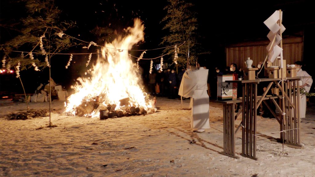 毎年1月14日、若草稲荷神社では、厳粛な神事とともに、米川地域でつかわれた正月飾りを境内で焼き、一年の無病息災・家内安全を祈願する。
